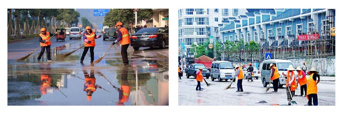 快速清理大面積路面垃圾、灰塵;人工清掃針對人行道、路邊死角,用掃帚、簸箕等工具細(xì)致清理。